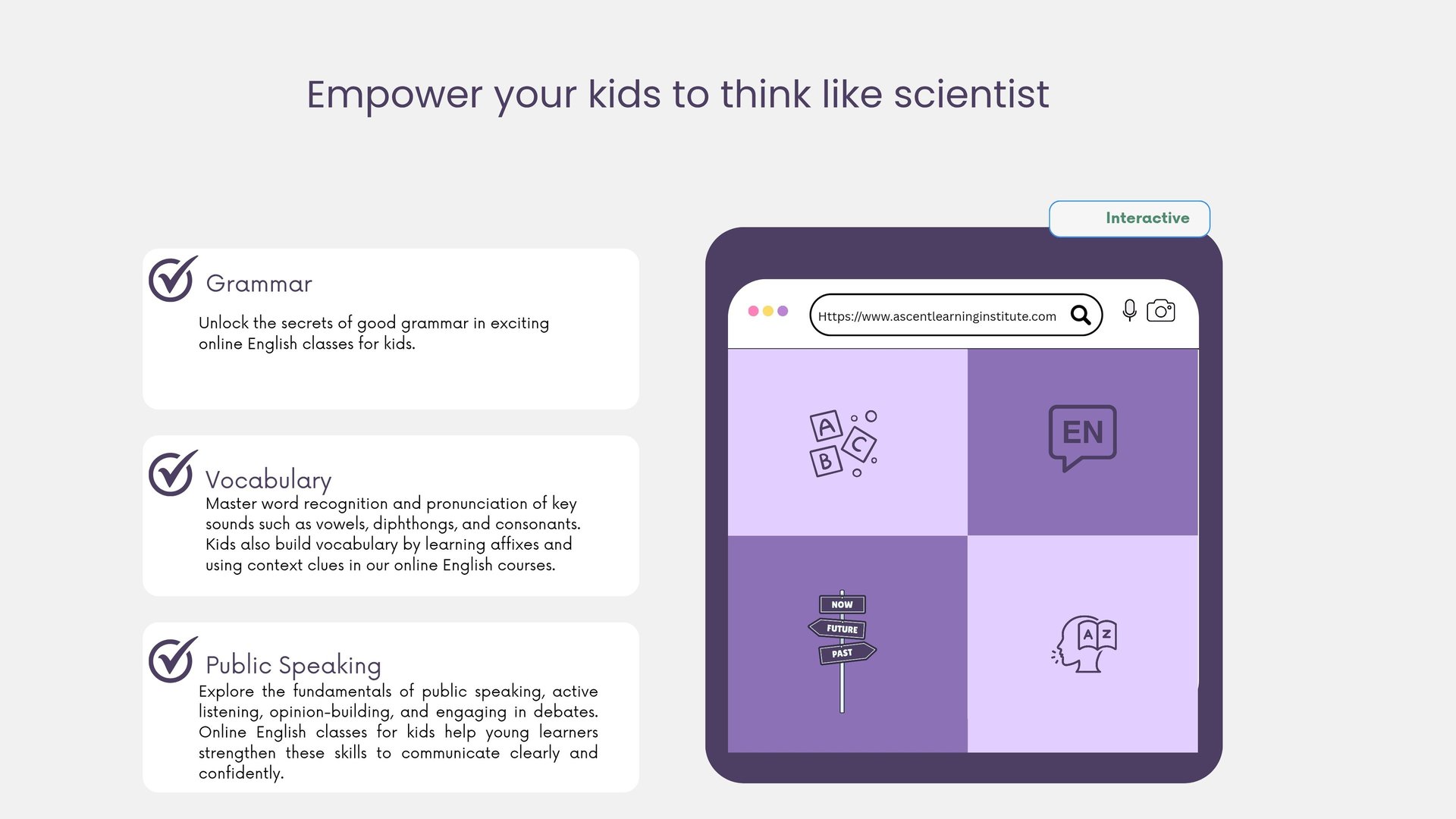 Engaging online English classes for kids from 1st to 12th grade.